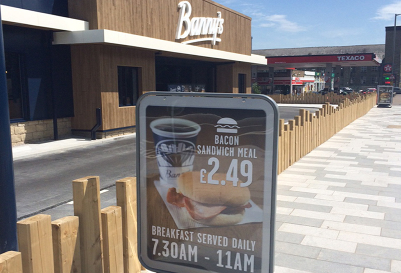 Working with Marketing Coordinator Kimberley Hobson, to supply ‘Bannys’ branded wall signs, interior display, menu boards, pavement signs and attractive promotional window graphics.